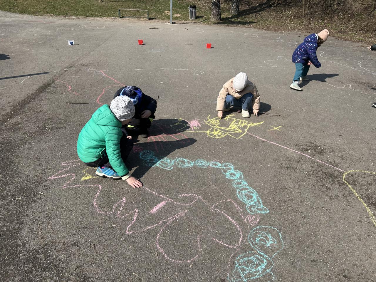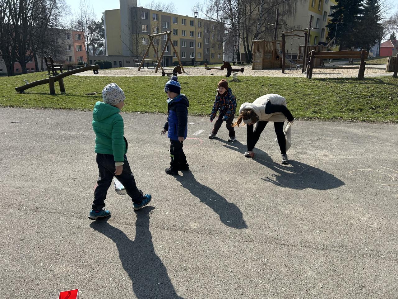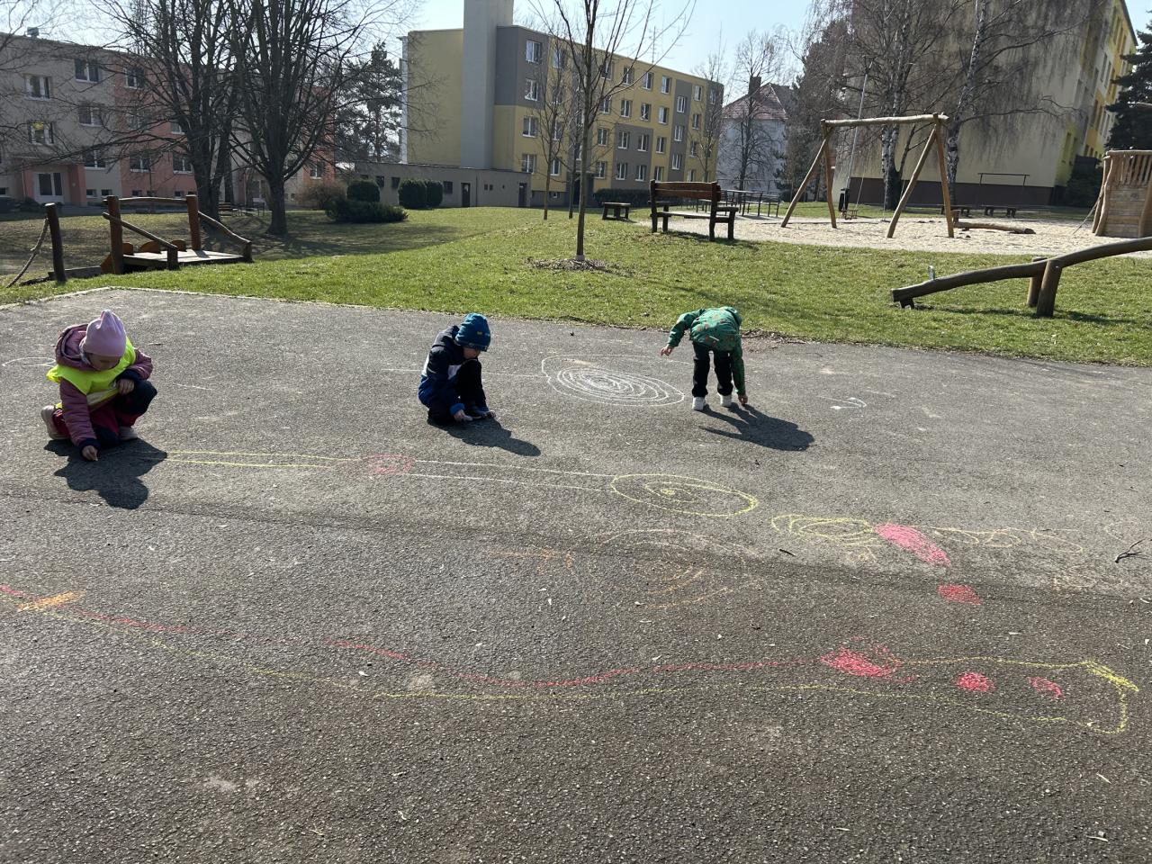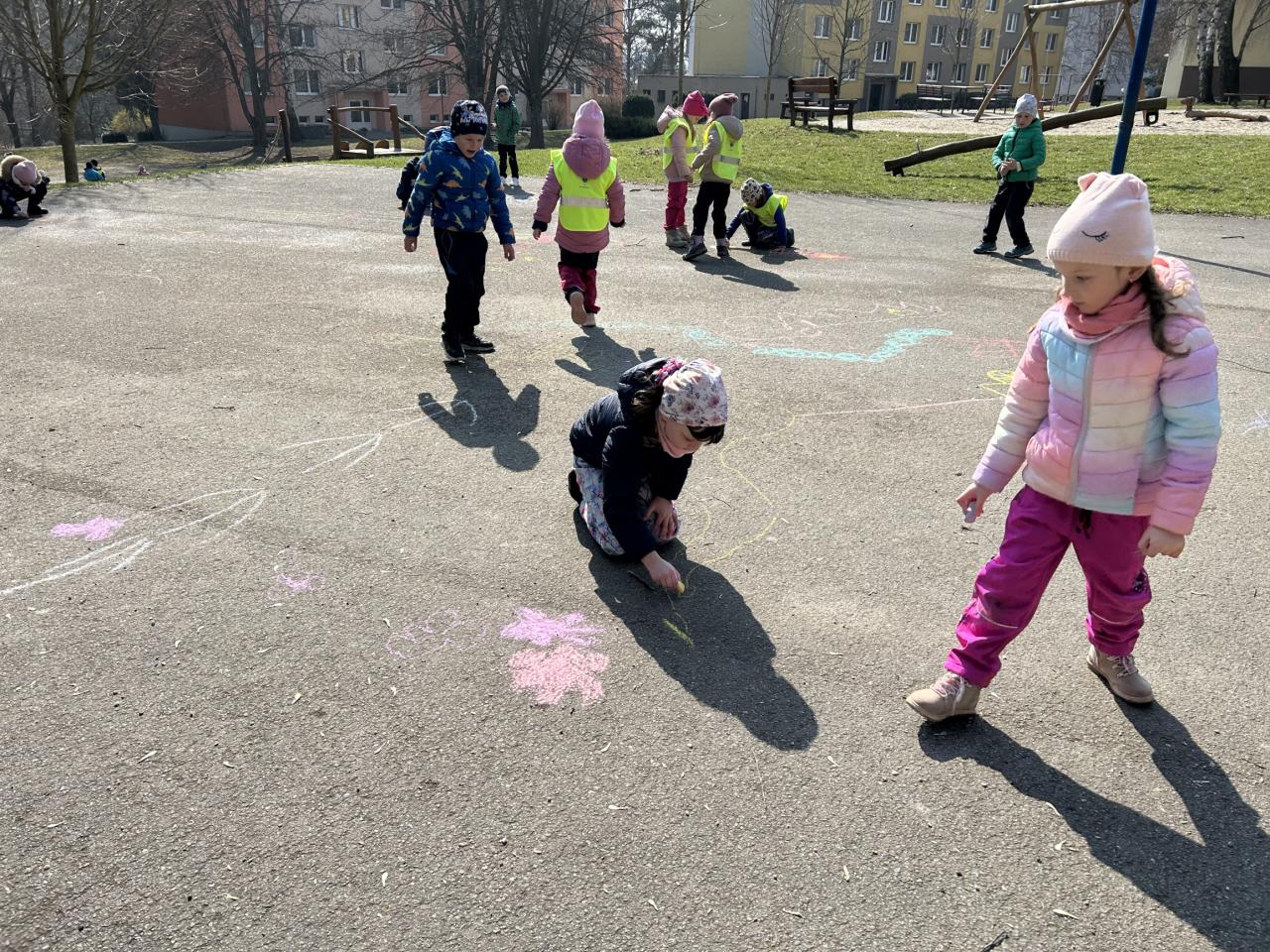 Děti pracovaly ve skupinkách. Kytičková stezka - kreslená křídou. Hledání jarních předmětů dle zadání.