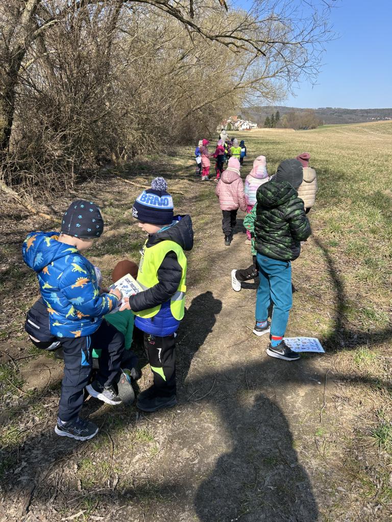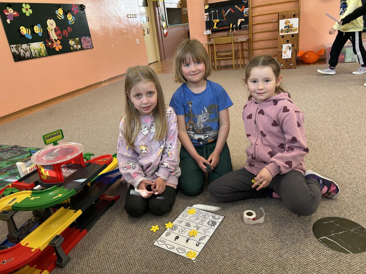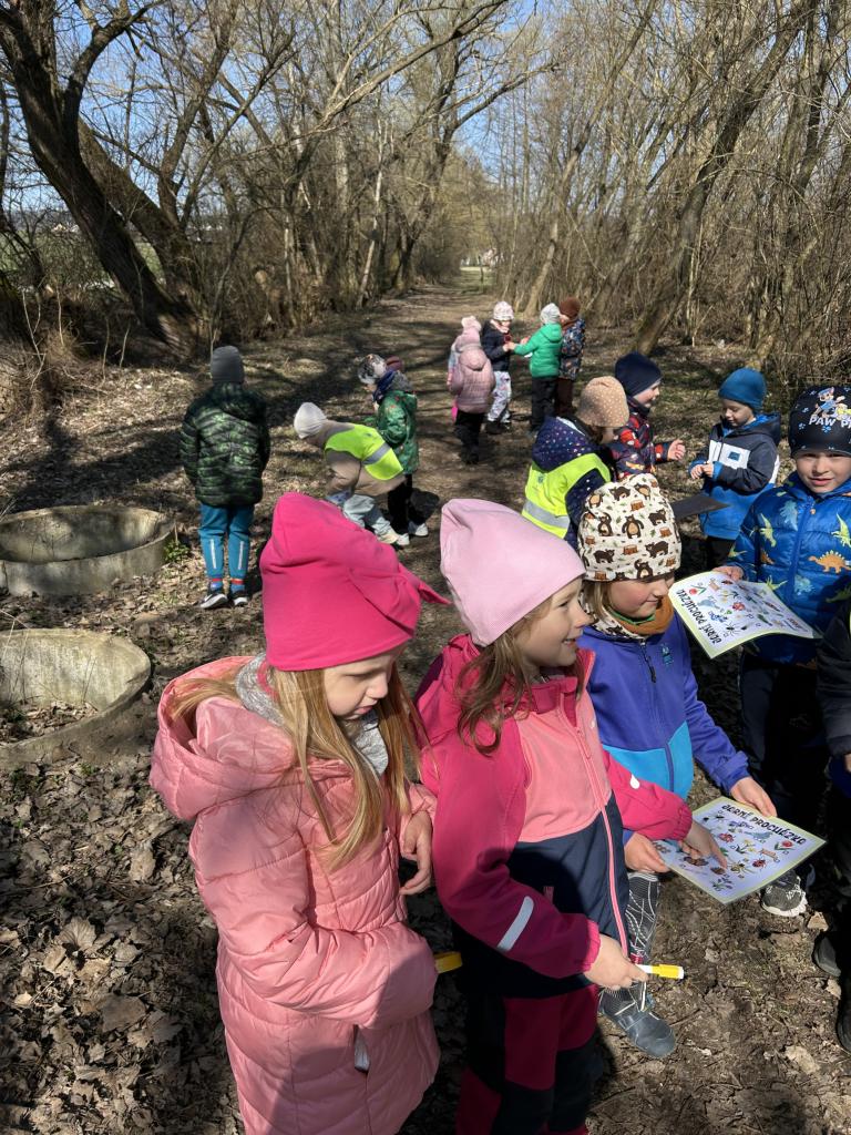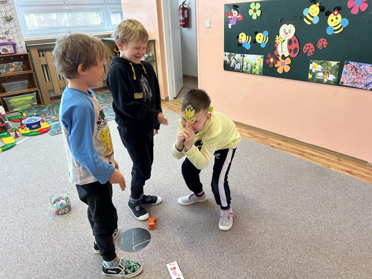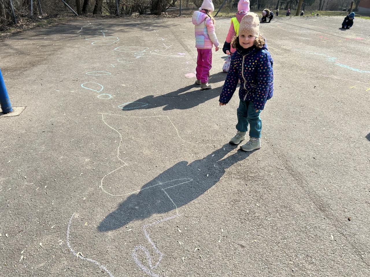 Děti pracovaly ve skupinkách. Kytičková stezka - kreslená křídou. Hledání jarních předmětů dle zadání.