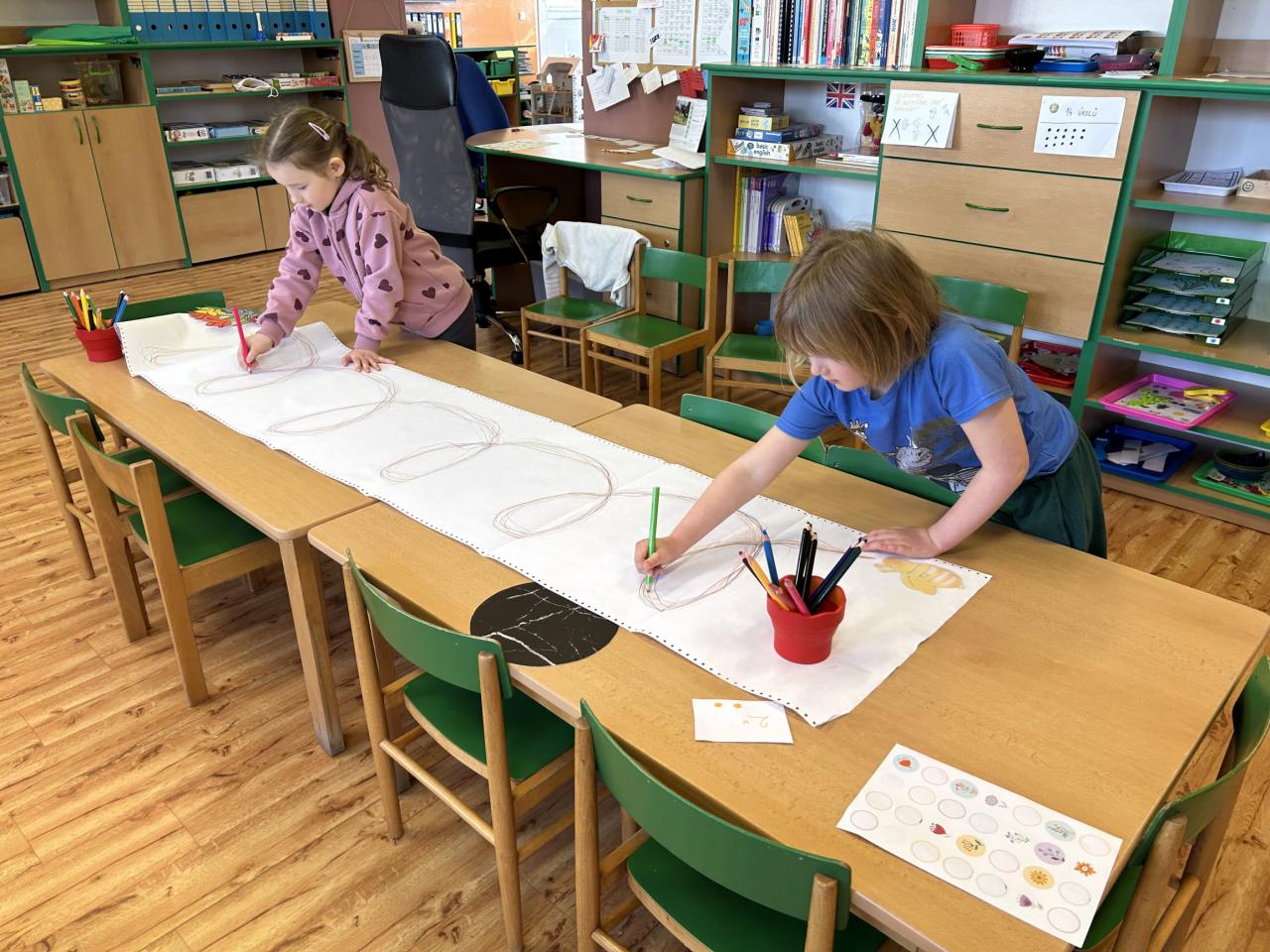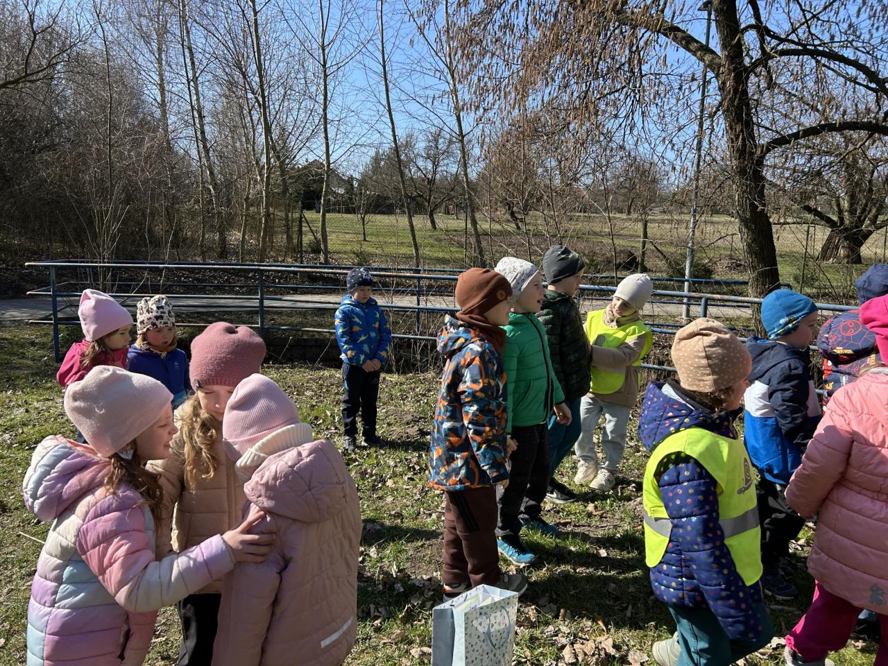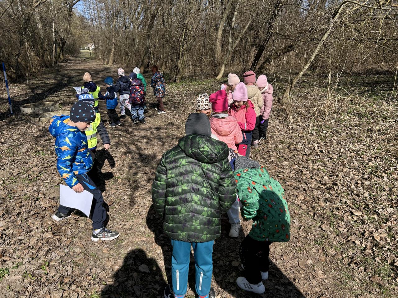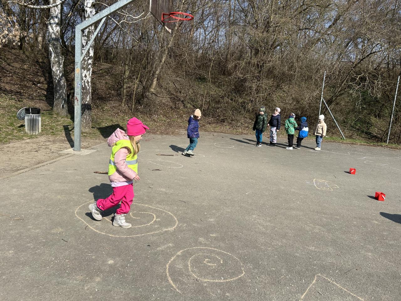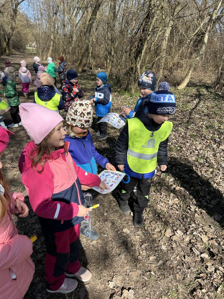 Děti pracovaly ve skupinkách. Kytičková stezka - kreslená křídou. Hledání jarních předmětů dle zadání.