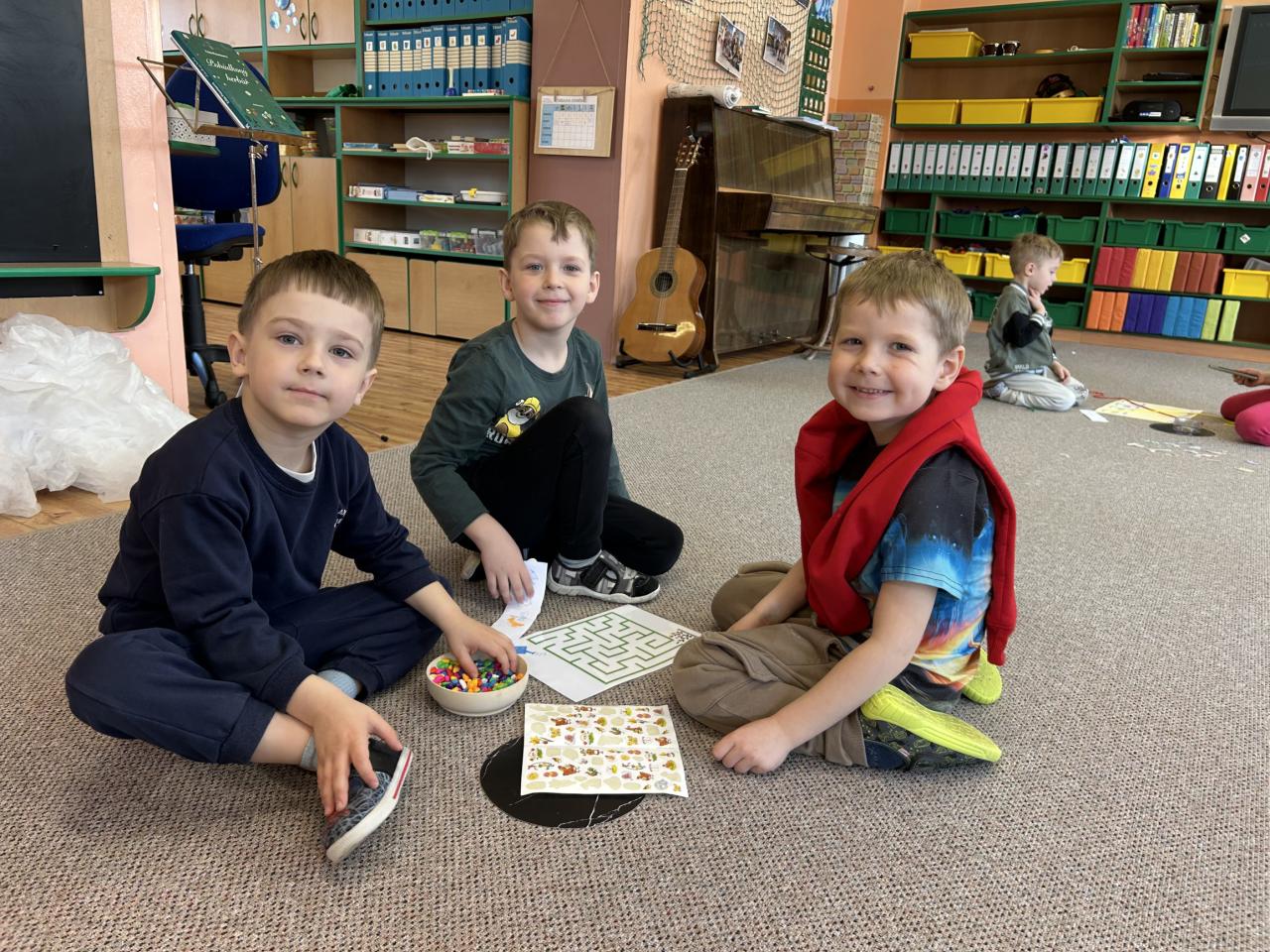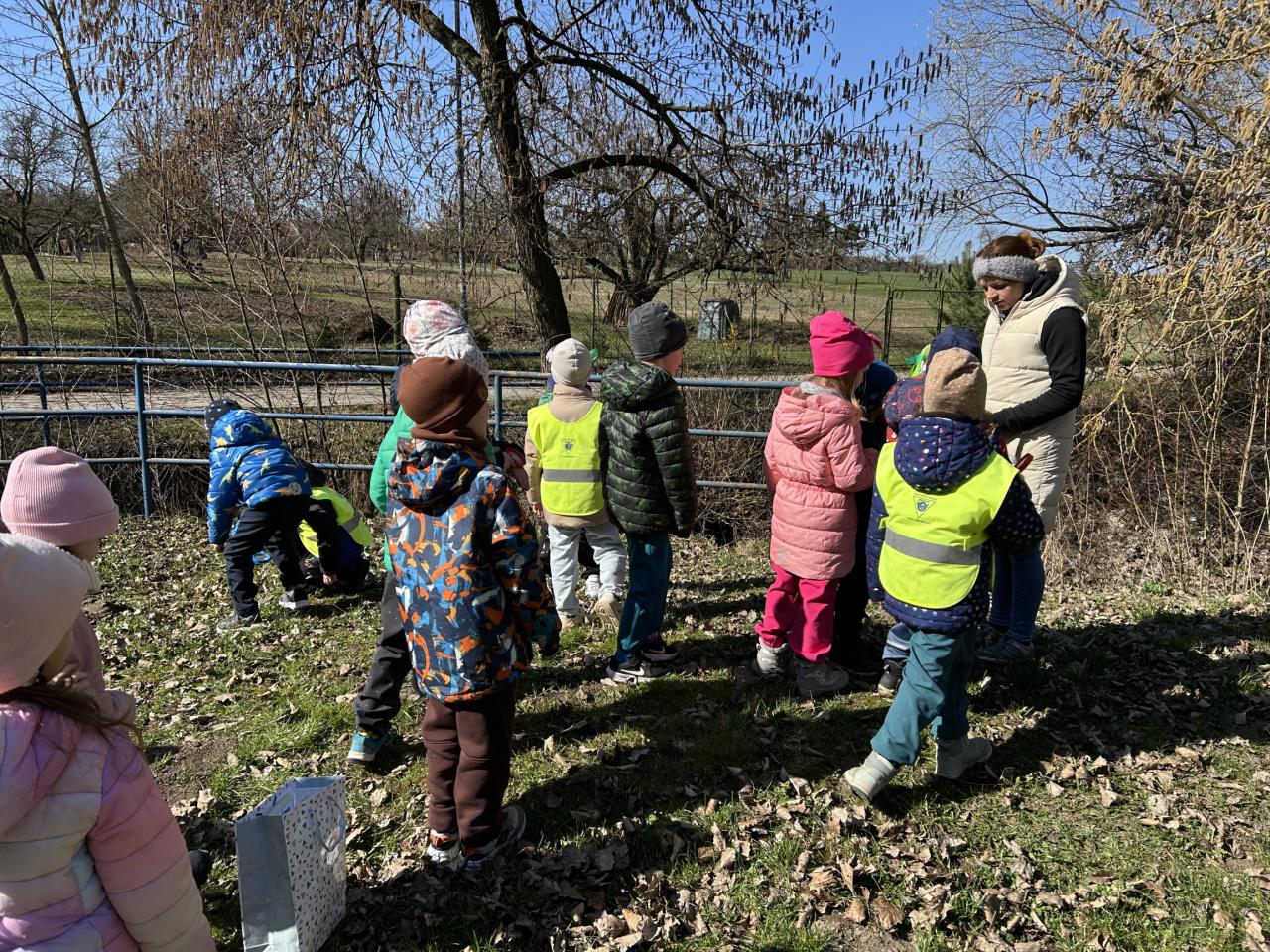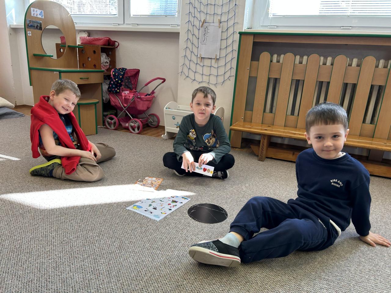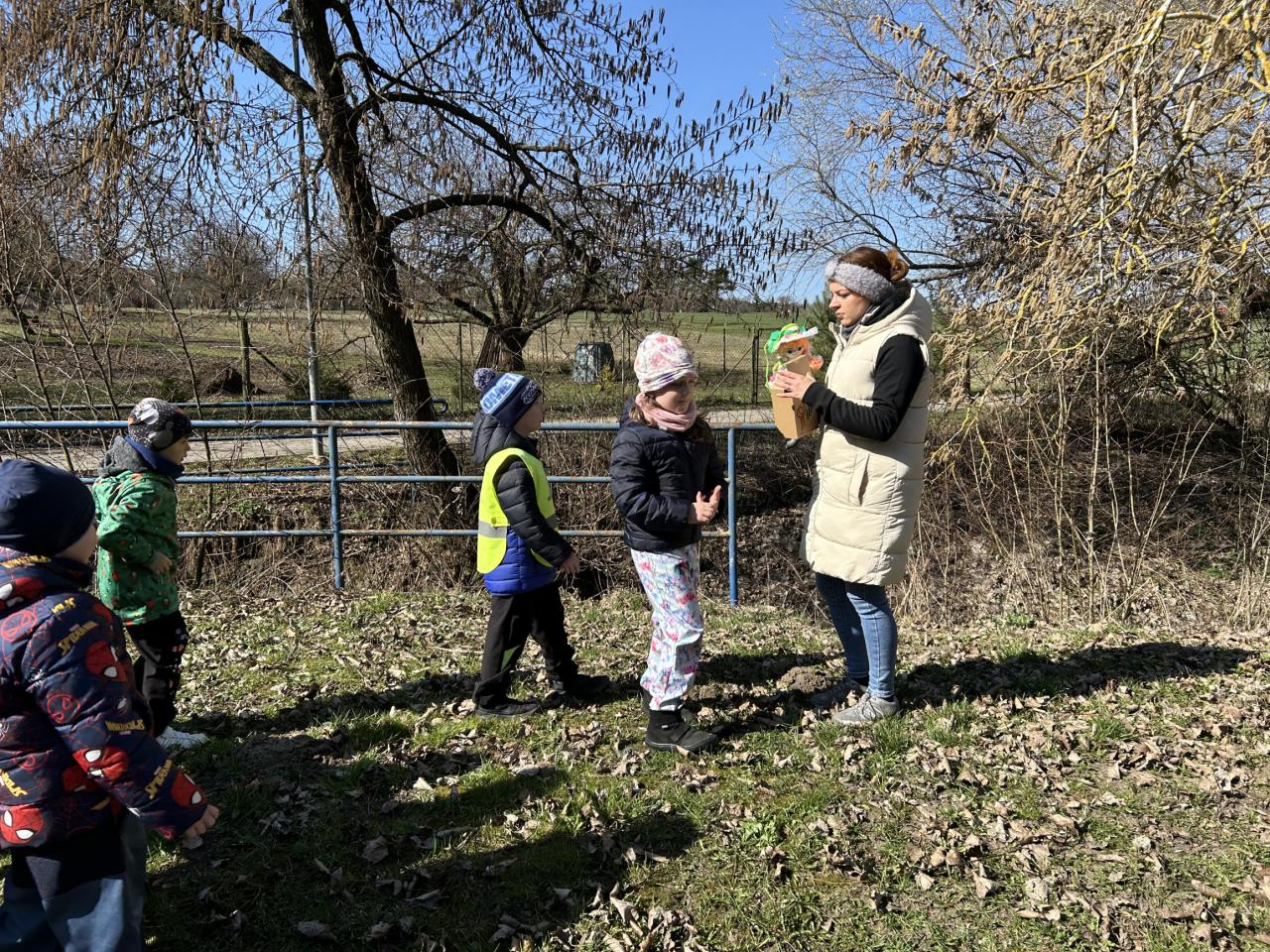 Děti pracovaly ve skupinkách. Kytičková stezka - kreslená křídou. Hledání jarních předmětů dle zadání.