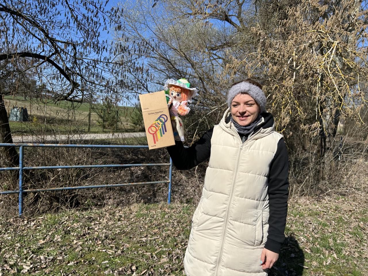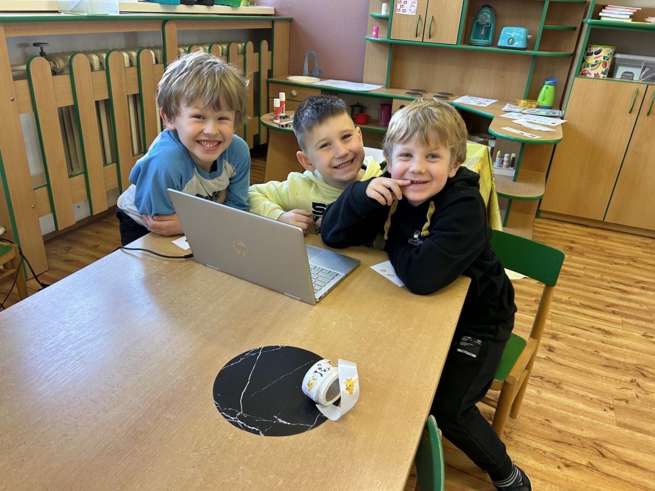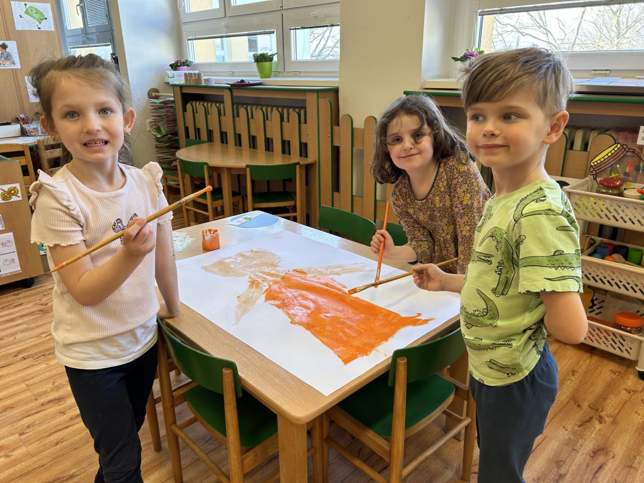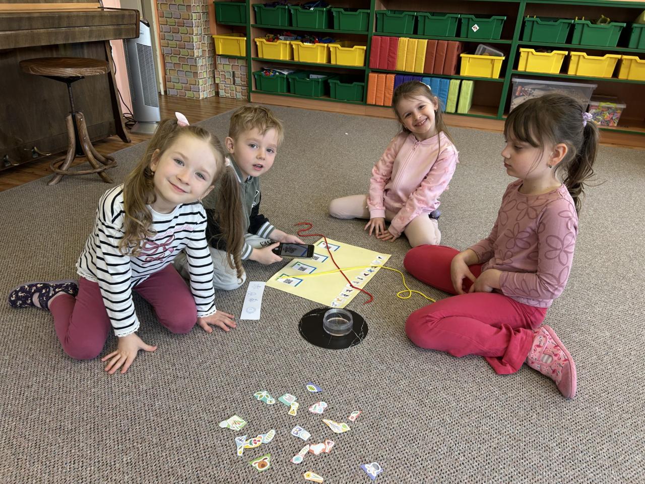 Děti pracovaly ve skupinkách. Kytičková stezka - kreslená křídou. Hledání jarních předmětů dle zadání.