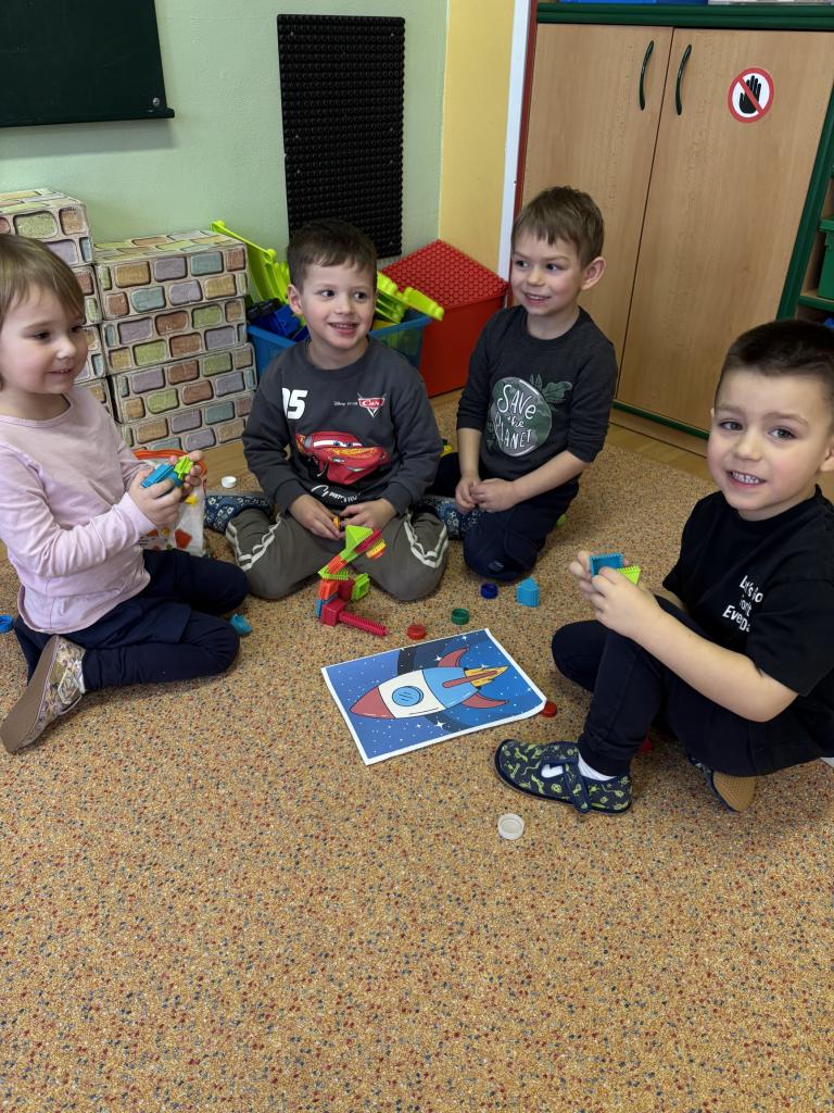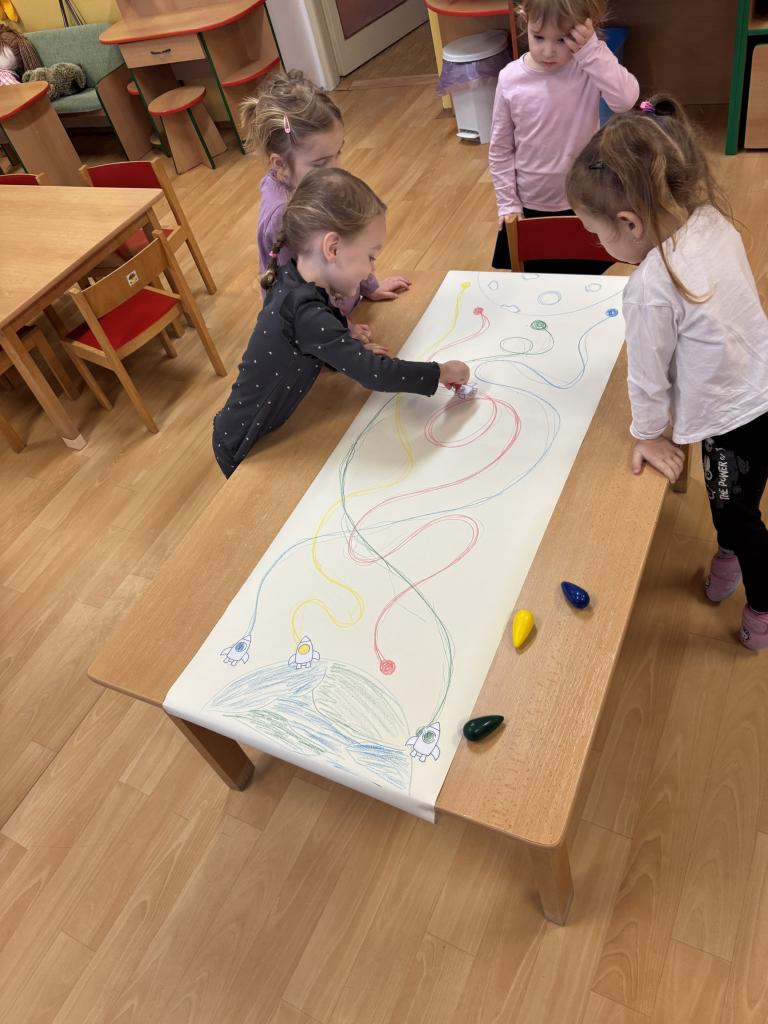 Vesmírný týden- děti si vyzkoušely pokus - start rakety, skládaly a stavěly rakety, zahrály si na tajemný nástroj handpan, procvičovaly grafomotoriku při závodech raket.